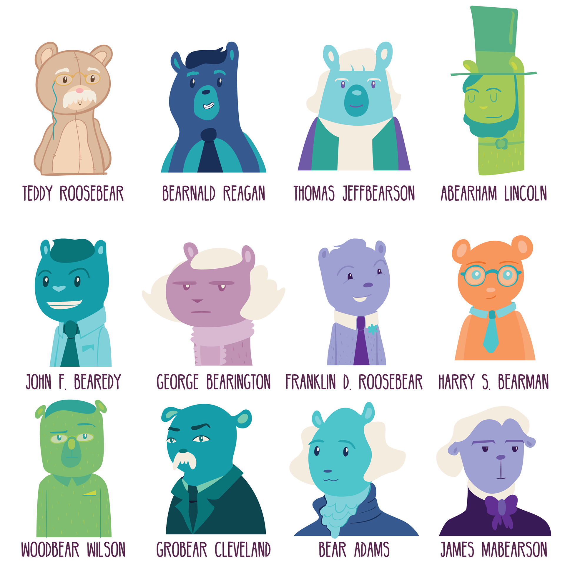 A short series of illustrations that came from a friend's idea of creating a children's book of all (bear) U.S. presidents. Here is a sample of some of them.